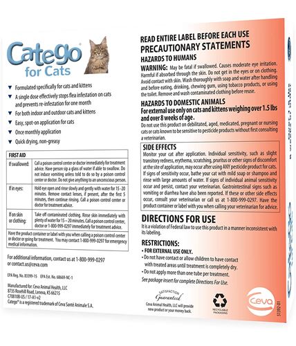Catego®was designed specifically for cats and only cats. It is the only product with the unique combination of these three proven active ingredients: Dinotefuran, Fipronil and Pyriproxyfen.