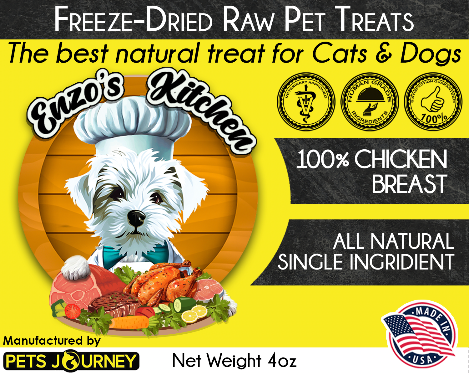 Pets Journey Freeze-Dried Chicken Breast Treats contains no Preservatives, Fillers, Chemicals, Salt or Artificial Ingredients