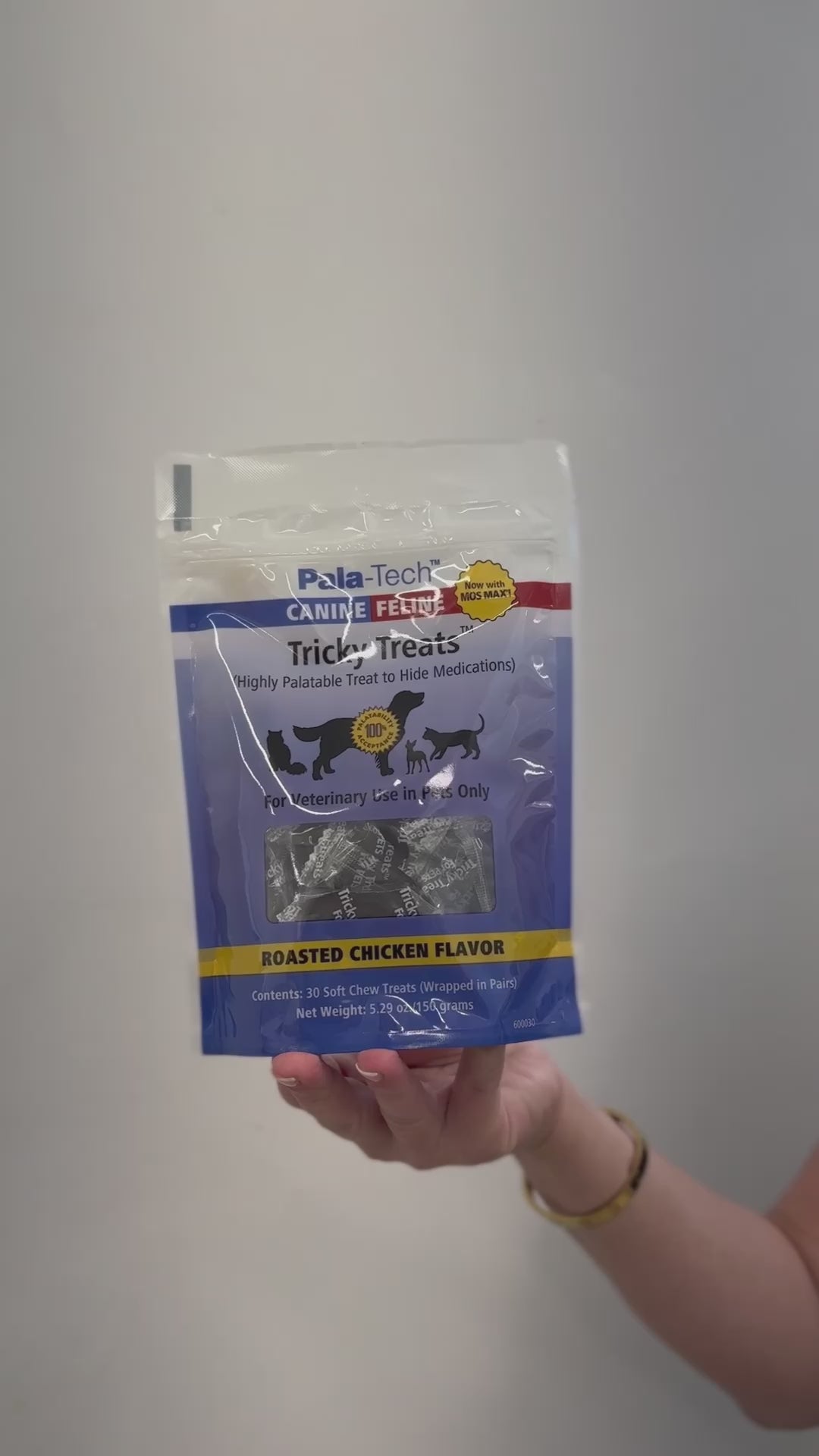 Gently massage the treat between your fingers to release its natural oils and avoid touching Tricky Treats with the same hand that handles the medication.